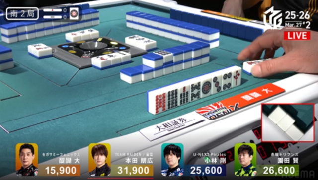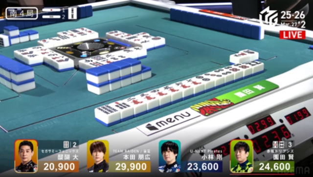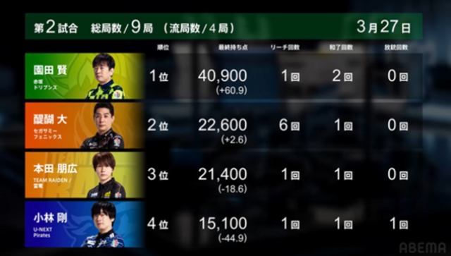 対局はその後、全員にトップの可能性が残されたオーラス南4局2本場で、園田が会心の6000(は6200)オールを決めて突き抜けた。これにより、セミファイナル最終日の卓組に影響するフェニックスとの4位争いにも決着がついた格好となった。