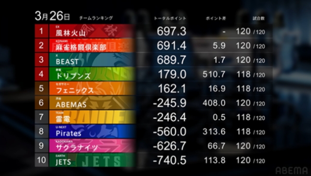 ABEMASが臨んだ26日の対局では、第一試合に白鳥が痛恨の4着をひくも、大将・多井が第二試合で値千金のトップ。素点も大きく稼ぎ、なんと0.5ポイント差で雷電をかわした。