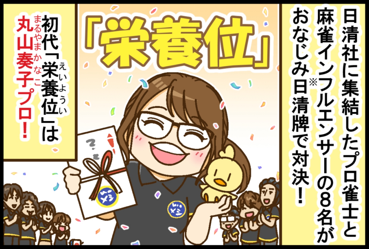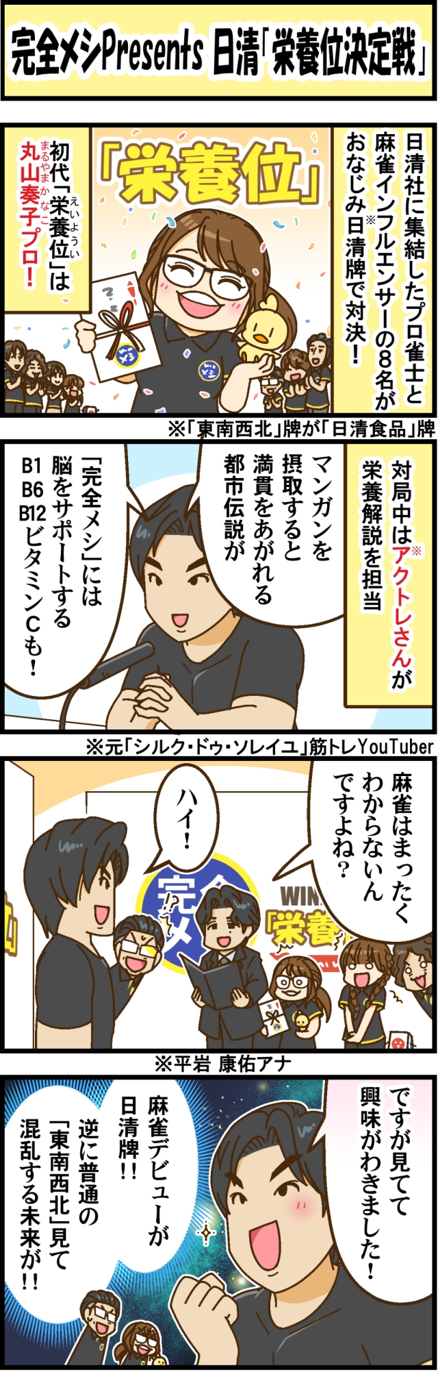 【完全メシPresents 日清「栄養位決定戦」】プロ雀士と、麻雀インフルエンサー8名が日清牌で対決! 初代「栄養位」は丸山奏子プロ!【Mリーグほぼ毎日4コマ】藤島じゅん/VOL.1074