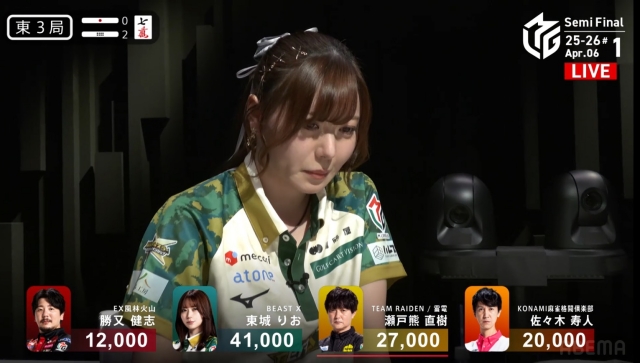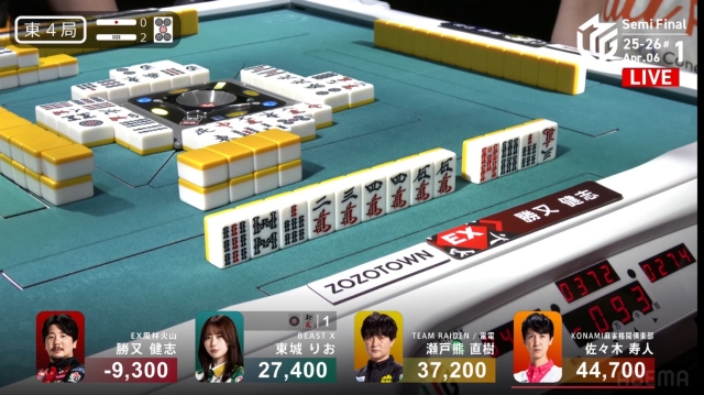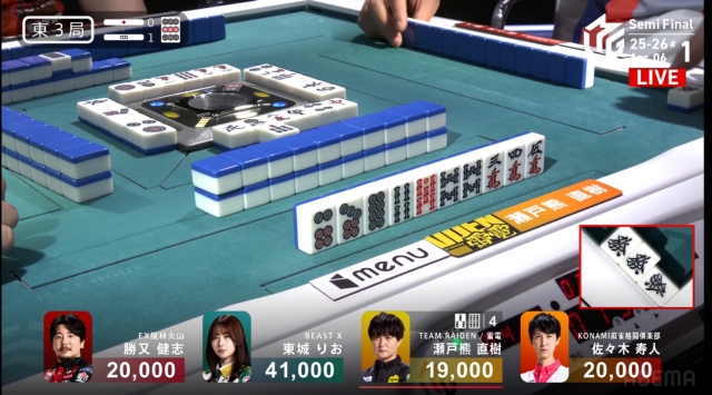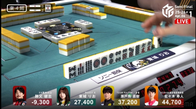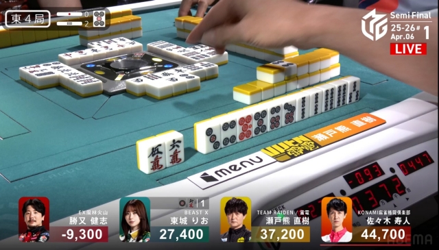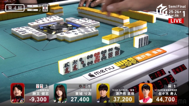 このアガリで、瀬戸熊が東発で倍満をアガった東城を捲ってトップ目に立った。