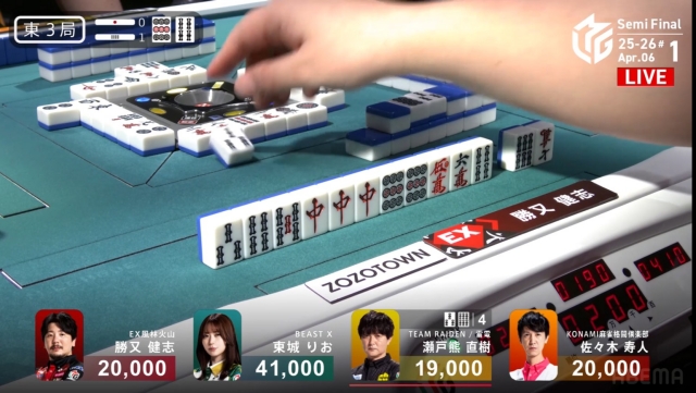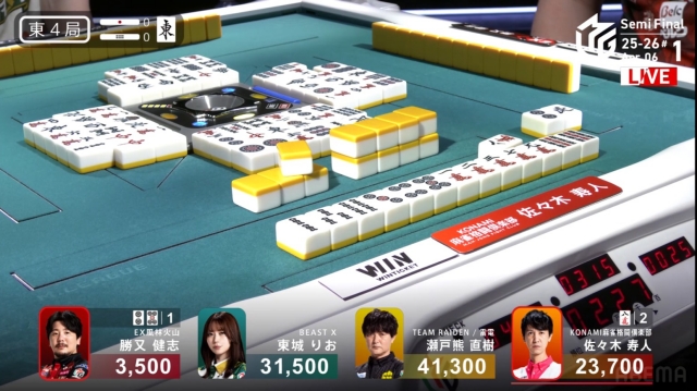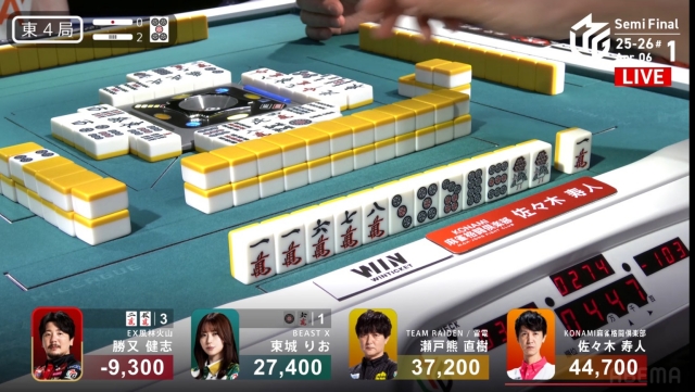 3局連続和了で一気に3万点近く稼いだ寿人がトップ目に。