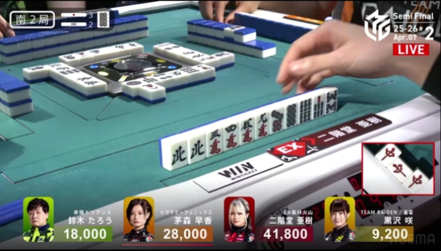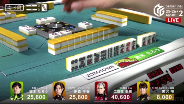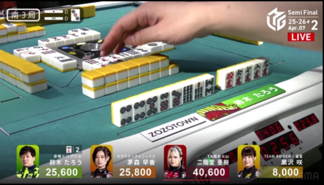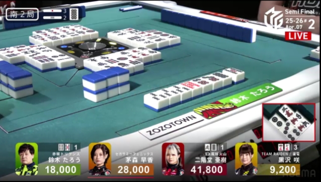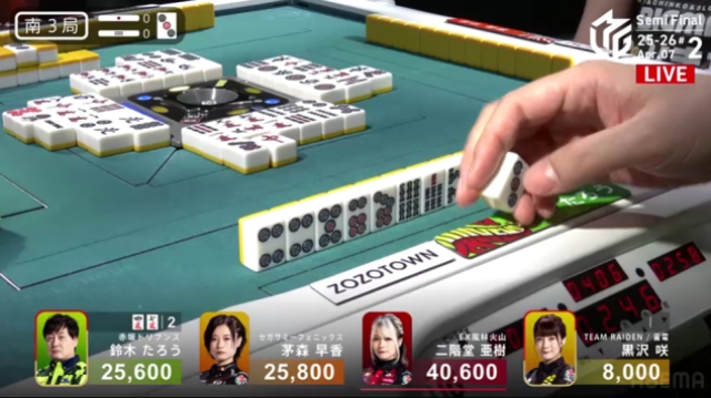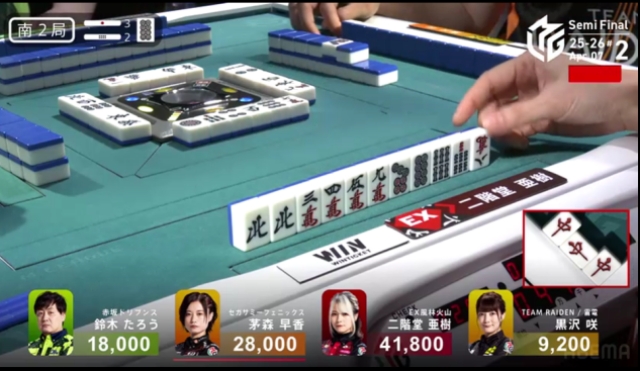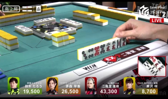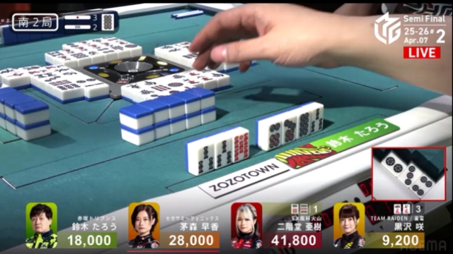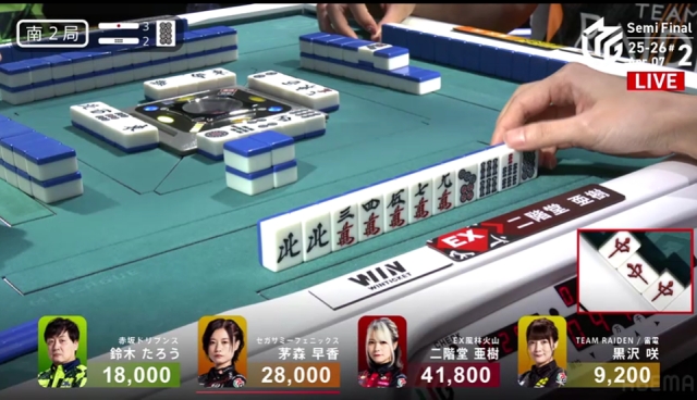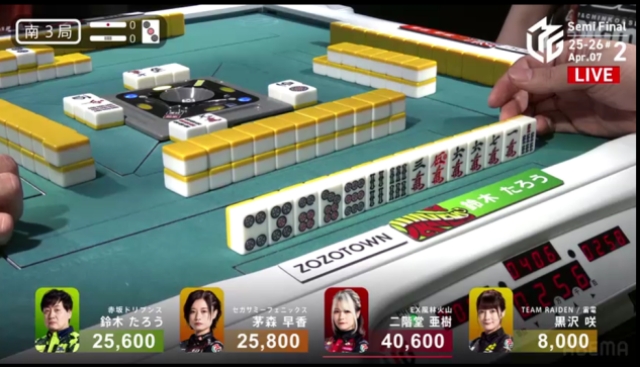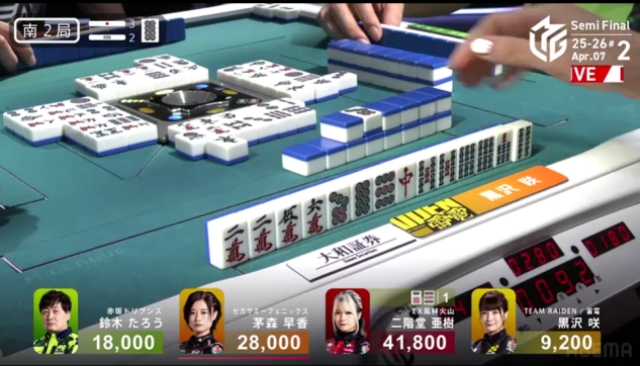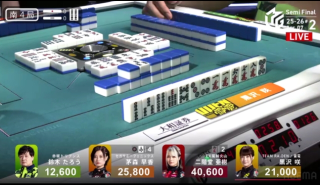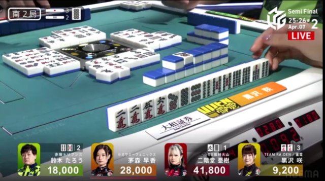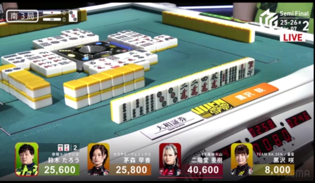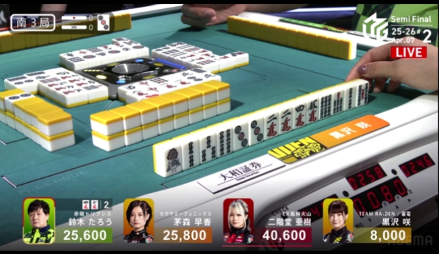この局は黒沢が一気通貫でリーチするも流局。親の茅森とのふたりテンパイ。