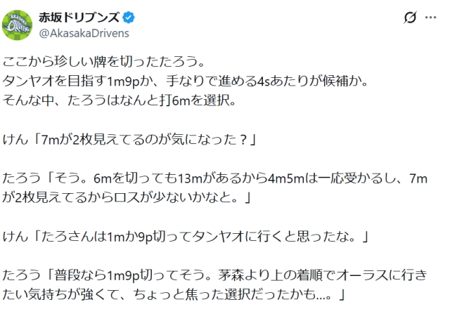 リーチをしているとたろうに放銃だったが、ダマだったおかげで奇跡のスライドが可能に。しかもイーペーコーもついた。