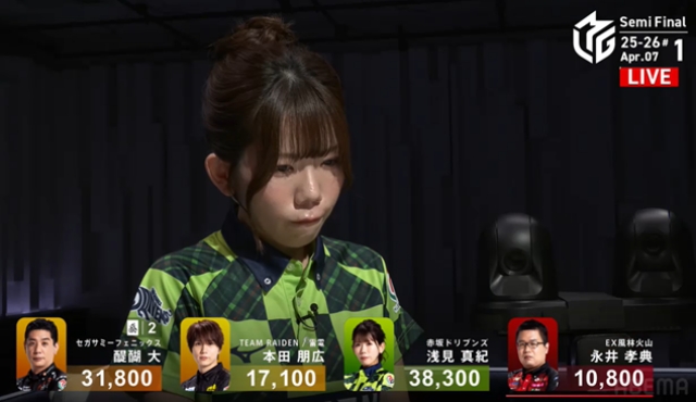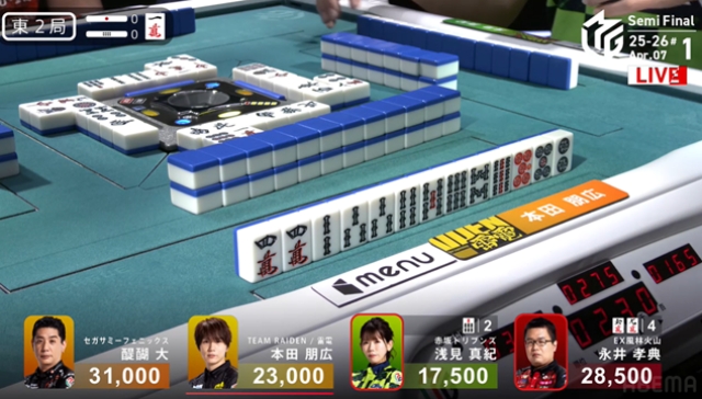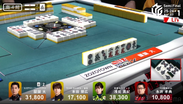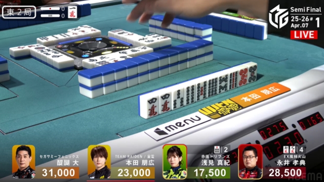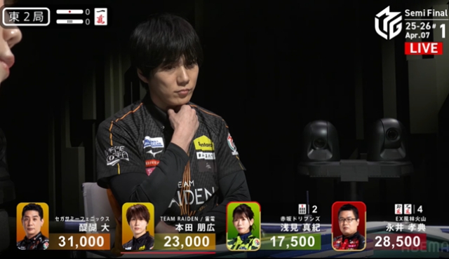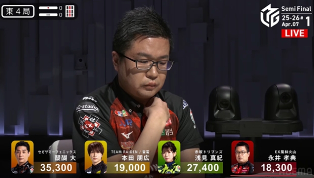 雷電の本田朋広がレギュラーシーズン最終試合で、持ち前の目いっぱい牌を持ち、手を広げることを封印していたが、今日はまだ序盤。のびのびと打つことが予想される。