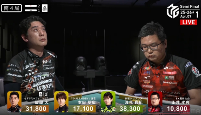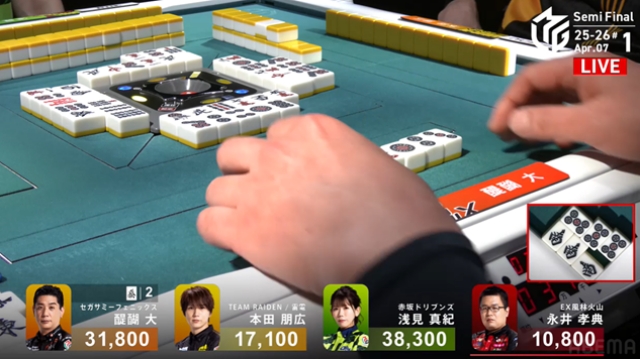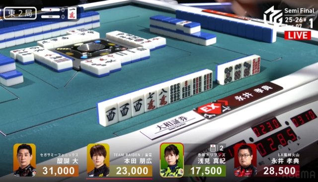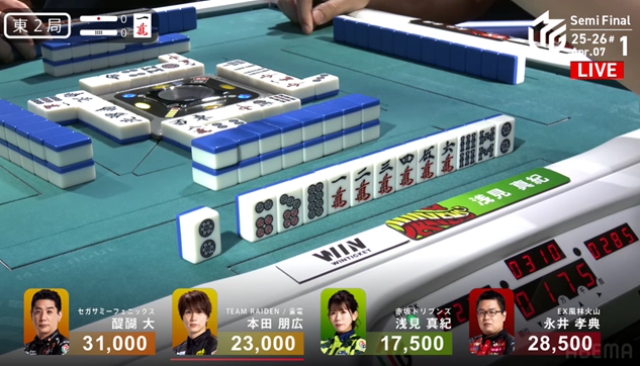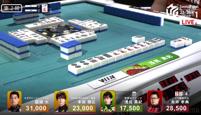 しかし勝負の世界、結果は無常である。永井の当たり牌は山になく、浅見がマンガンのツモアガリ、永井は親番を維持することもできず5000点の失点となってしまう。