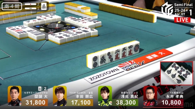 で放銃する可能性も低いから、と聞こえてきそうな仕掛け。他チームよりもポイントのビハインドがあること、ものすごく前向きに考えるとリーチ棒が2本供託に出たことにより、アガリの価値が上昇したことも要因に入るだろう。