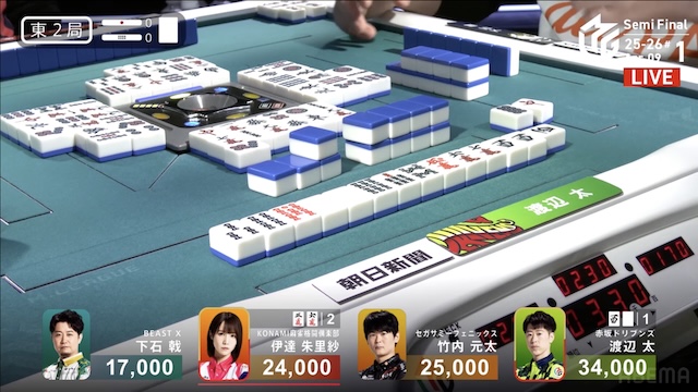 1戦目、東2局で太さんの勝負手が一発で決まって4000-8000。テンパって一瞬間があったので、ダマテンもあるのかなと思ったけど、即リーチに行ったのは素晴らしかったです。太さんのドリブンズって、まだトップがなかったんでしょ?麻雀格闘倶楽部もそうだから、これは伊達さんと太さんの勝負なんだよね。ここでトップを取るとみんなと戦えるけど、最後まで残っちゃうと厳しいんだよ。