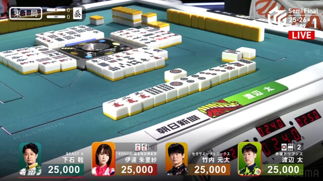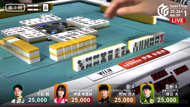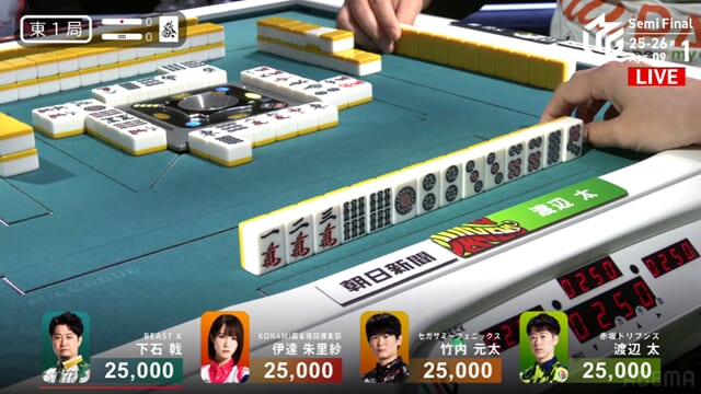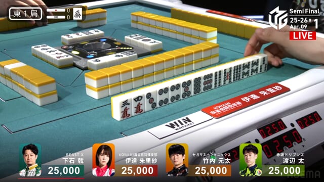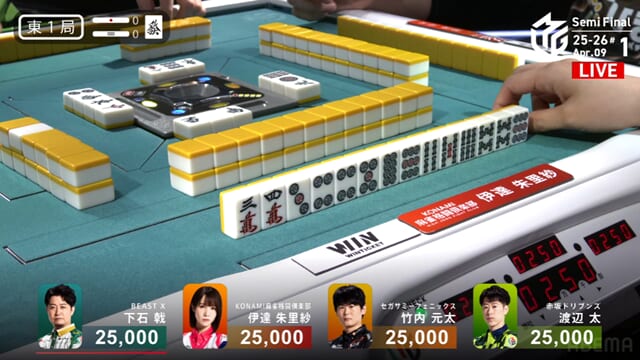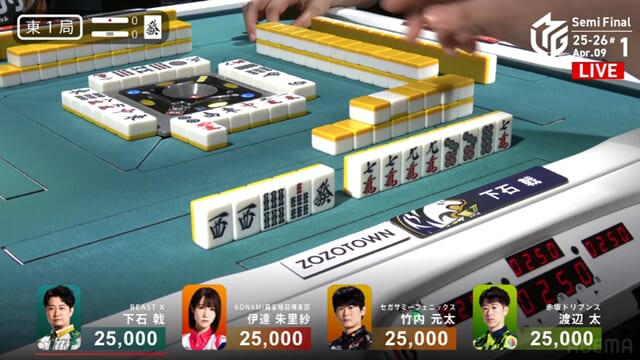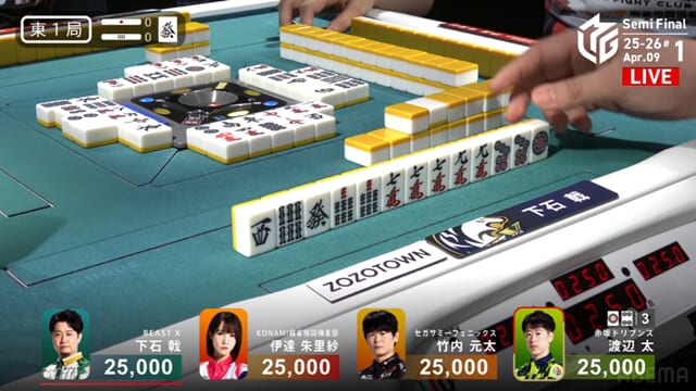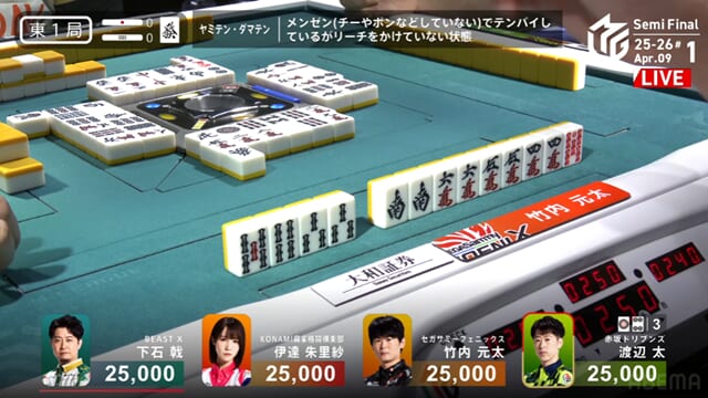 東1局から四者が激しくぶつかり合う展開となったが、太が見事にアガリをものにし、ドリブンズにとって最高の滑り出しとなった。