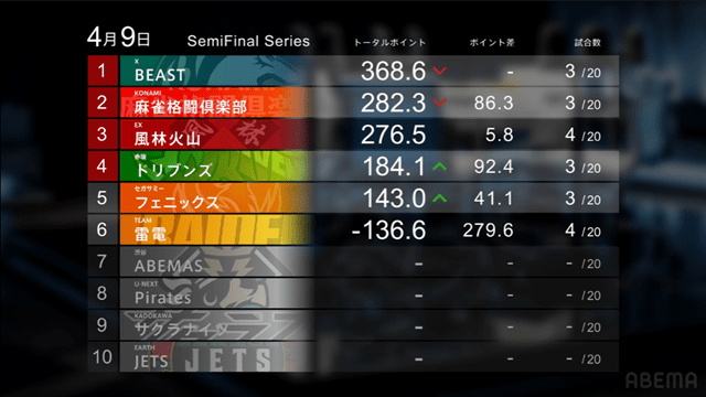 チームポイントはさらに混戦へと突入し、直接対決が続くセミファイナルは、ここから順位が目まぐるしく入れ替わる展開が予想される。