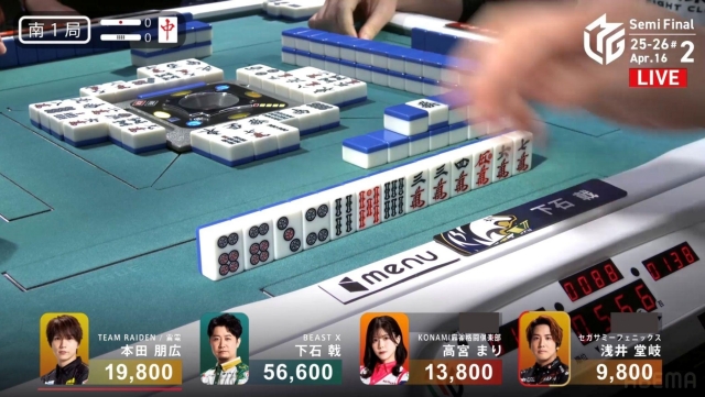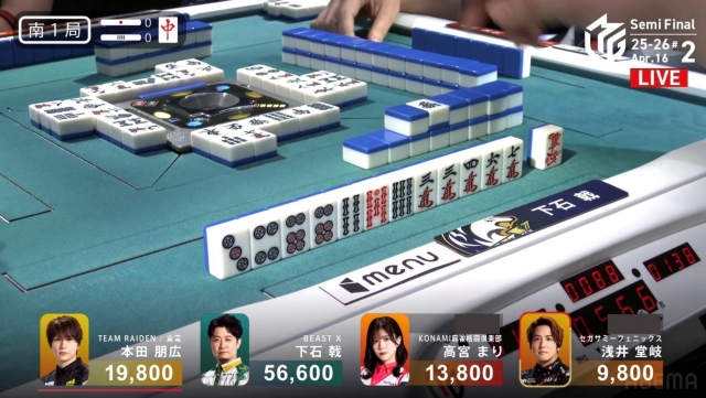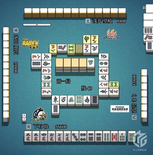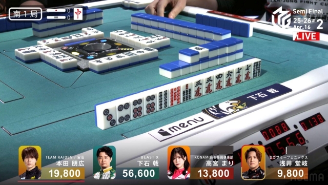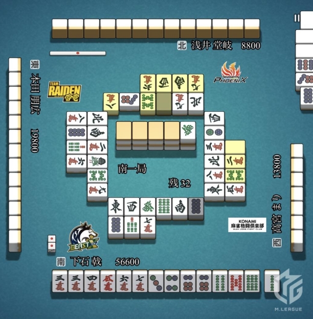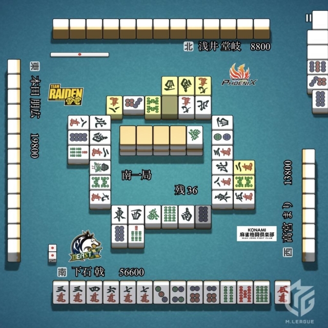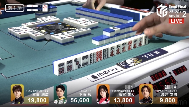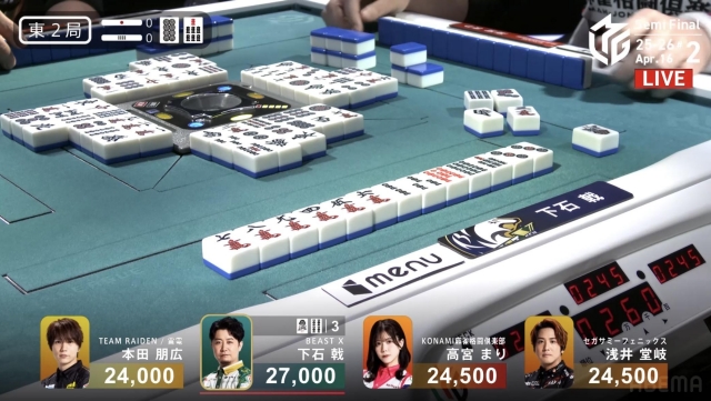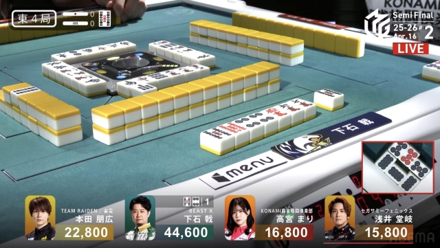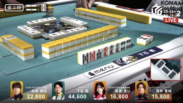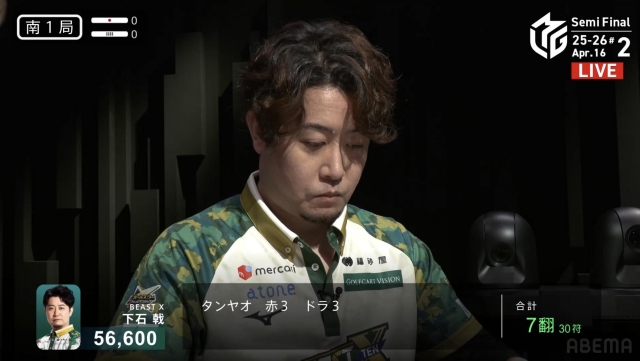 リーチ一発ツモピンフドラ赤裏、親で下石はハネマンのアガリを決めた。