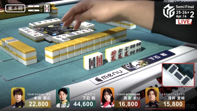 現物がないこともあり、2枚ある牌を切って気合いでオリたくもなるが、下石はストレートに進めていく。