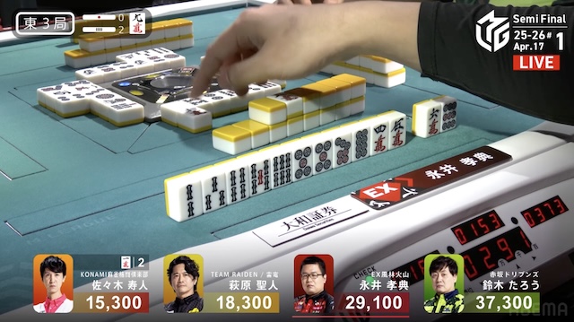 東3局の2本場、永井君が3メンチャンでテンパイしたとき、即リーチいくかと思ったけど、ドラポンしている寿人を警戒してヤミテンに。「親番で危険牌引いたらオリるのかな?」と思っていたけど、【6マン】を押していった。寿人の手出し【1マン】が単騎待ちかまだテンパイしていないこともあるからね。