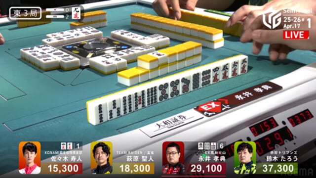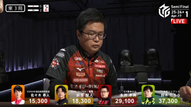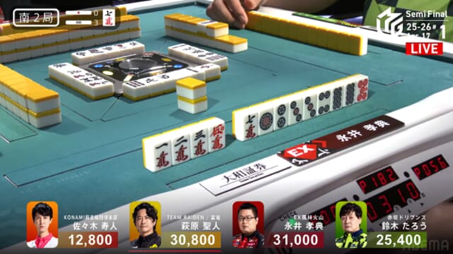 レギュラーシーズンでは、個人スコア賞をかけて同じくルーキーの下石戟(BEAST X)と競い合うなど、あまりにも強烈な印象を残した永井。好成績につながった「思い切った踏み込み」が実を結んだのは、東3局2本場だった。東1局でチートイツで3000-6000をアガるなど、たろうがトップ目に立っている。