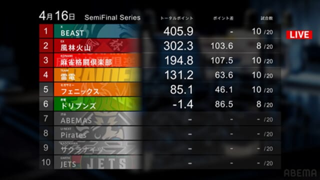 一方、苦しい戦いを強いられているのが格闘倶楽部とドリブンズ。雷電の上昇に飲み込まれるように、ポイントを大きくマイナスしている。特にドリブンズは、ファイナル進出のためにまずは最下位を脱出したいところだ。