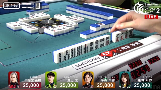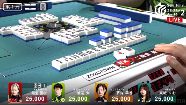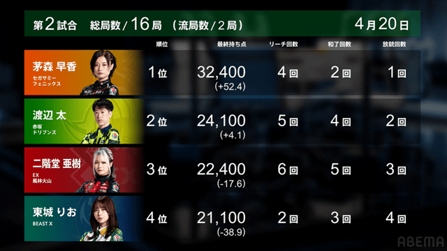 4位の東城は東場に相手のアガリ牌を吸収したうえで、1:3のめくり合いに勝つなど、「これは東城の日か」と思わせるシーンもあった。南1局時点では一度トップになるも、そこからテンパイ打牌が捕まってしまう。オーラスは盛り返すも、一歩及ばず2万点台の4着で終局した。