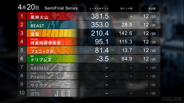 この試合結果でセガサミーが4位のKONAMIに迫るが、まだ100ポイント以上の差が残っている。逆連対の風林火山、BEASTは大きなマイナスではないのが救いで、まだまだ上位チームの座は揺るがない。