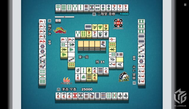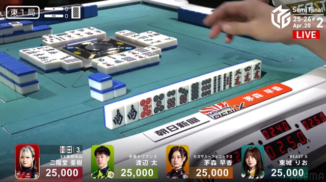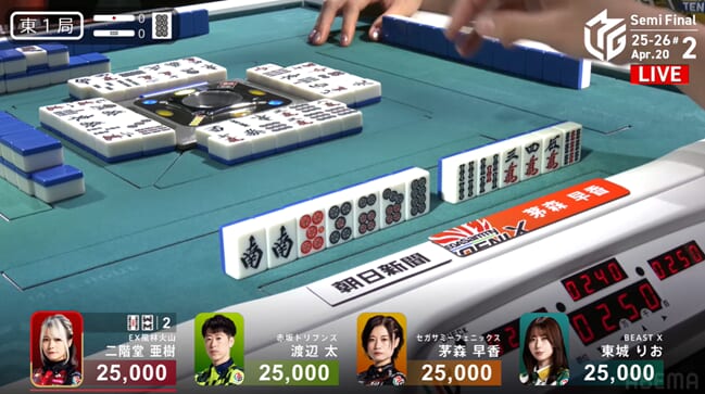 “親リーチ”は当然、平均打点が高く、押し返すことは相当に良い手か、よほどの自信がないと難しい。その1回の放銃が結果を左右することもある。開始すぐの東1局、目立ったのは茅森の押しの強さだった。