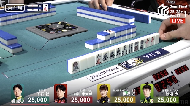 東1局の下石君、最初の配牌から大三元をアガリそうだなと思ったよ。黒沢さんがタンピンにいけそうな形になり、トイツだった【中】が鳴けて、余計アガれそうになった。黒沢さんのような打点系の人は【中】を落とすからね。下石君はあの大三元をアガれて、大したものだよ。