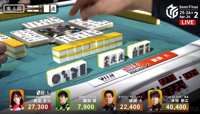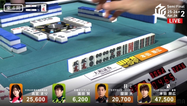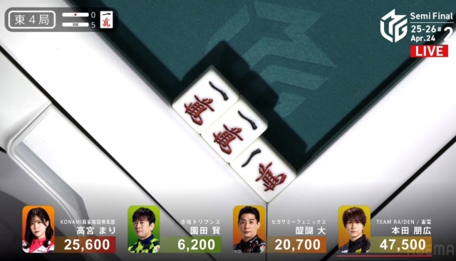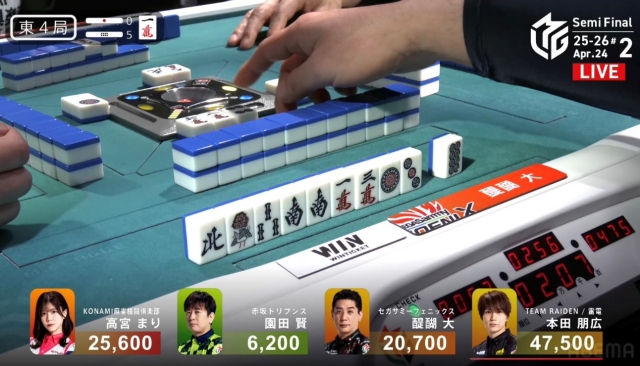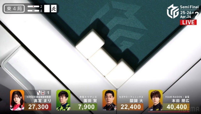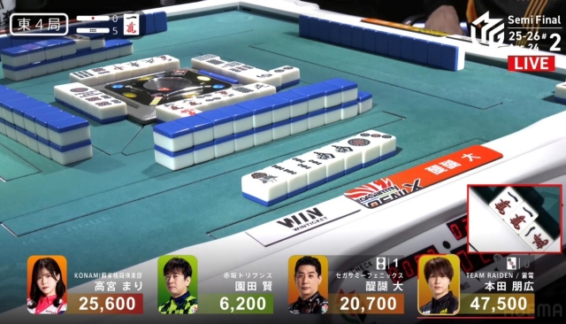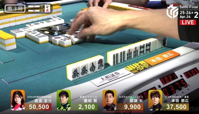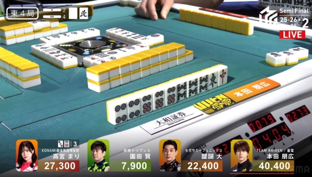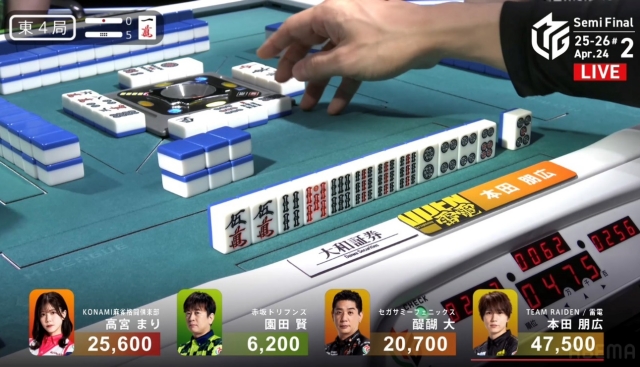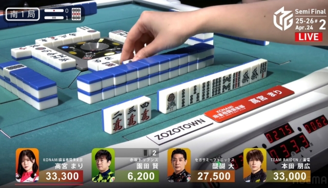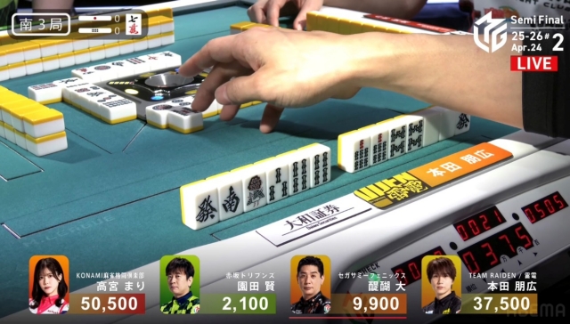 しかし、追い付いた醍醐に捲り負けてしまい、12,000点の放銃。