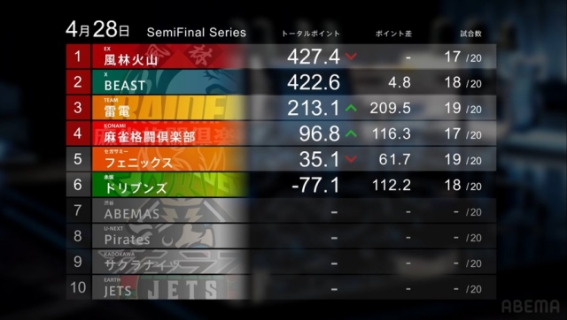 レギュラー最終盤では、雷電とABEMASとのボーダー争いと並行して、ドリブンズとフェニックスとの「最終日に打てる権利」を巡る順位争いも行われていた。