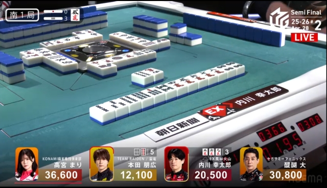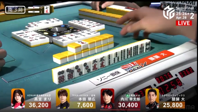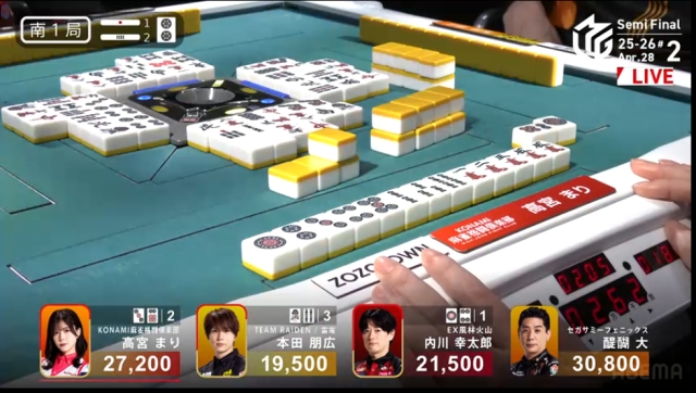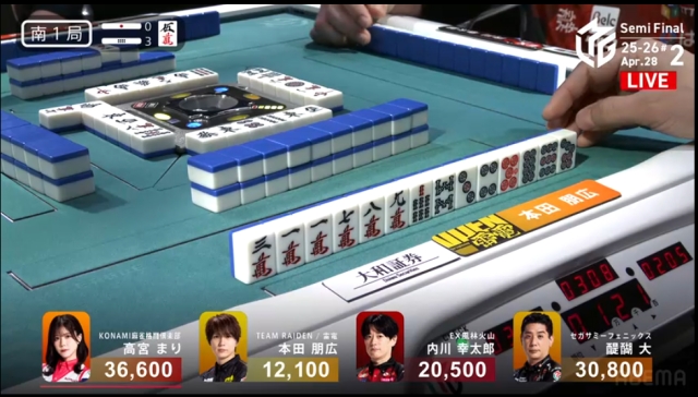 現状、高宮=KONAMIがトップ目という最悪の状況で、自分が安い手であがるくらいなら親の内川に連荘してもらい、高宮をまくってもらいたい。そうすれば後は、ラス親で自分が噴けば並びが完成。いわゆる着順操作というか、並びを作るのが大事な場面。典型的な、条件戦ならではの戦略だ。