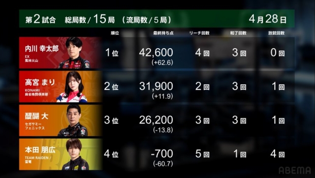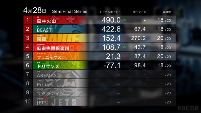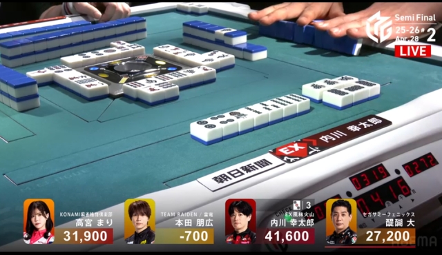 レギュラー最終盤に渋谷ABEMASと雷電がボーダーを巡って大接戦を繰り広げたように、セミファイナル最終盤はKONAMI麻雀格闘倶楽部とセガサミーフェニックスの、ほぼ一騎打ちの構図か。