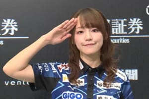 ファイナルシリーズ、KONAMI麻雀格闘俱楽部初の勝利インタビュー。このポーズを、この笑顔を、待ちわびたファンの方も多いに違いない。