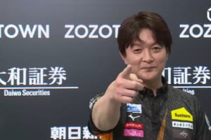 驚くことにテンパイ一番乗りは前原だった。この力強さに筆者はしびれた。結局岡田も手牌はすべて萬子に染まったのだが、テンパイには至らず。前原が女性陣から1000点棒を奪い取り、流局となった。「おじさんの勝ちでいいかな」。