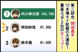 勝利者インタビューで和久津は「ちょっとニヤニヤが止まらなくて、最後あいさつも忘れるぐらい緊張しました。まだうちのチームは、完全に私が足を引っ張ってしまっているので、景気づけにトップ取りたいなと思っていたらドラがいっぱい来てくれて、ラッキーでした」と語った。