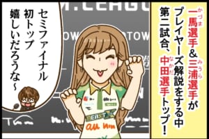 Mリーグニュース 【Mリーグ2025-26】中田花奈選手、石井一馬・三浦智博両選手がプレイヤーズ解説をする中、セミファイナル初トップ!【Mリーグほぼ毎日4コマ】藤島じゅん/VOL.1077 2026.04.10 藤島じゅん