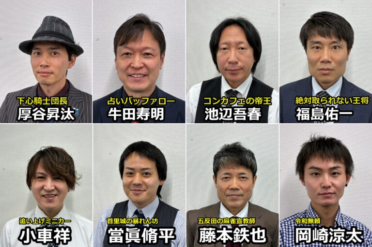 500名の参加者から勝ち上がった8名が集結 A卓 厚谷昇汰(連盟 下心騎士団長) 牛田寿明(RMU 占いバッファロー) 池辺吾春(連盟 コンカフェの帝王) 福島佑一(連盟 絶対取られない王将) ※福島プロは予選を勝ち上が…
