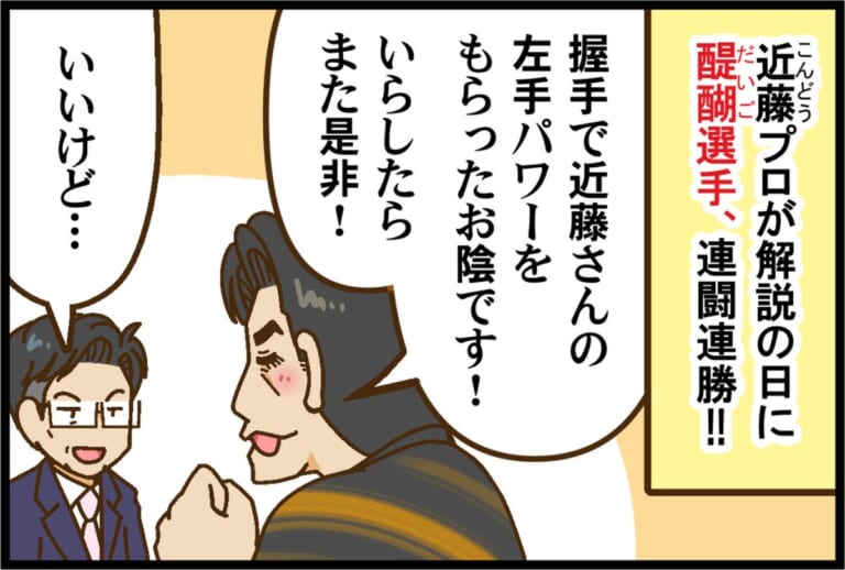 優勝決定!! KADOKAWAサクラナイツ、 堀慎吾選手が、熱戦を制して 沢崎選手に最高の報告!! 【Mリーグほぼ毎日4コマ】 2022年4月26日 作・藤島じゅん/VOL.286
